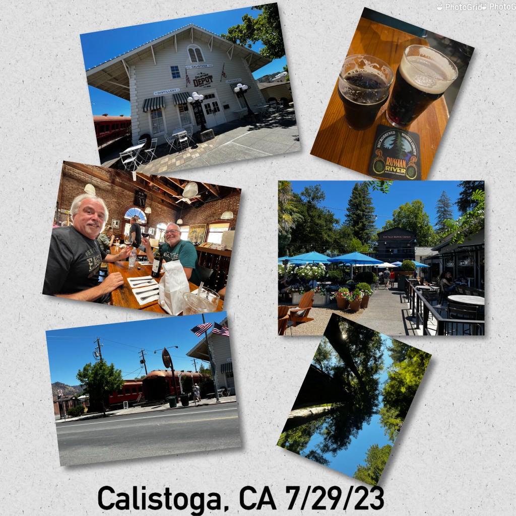 We had to drive through Calistoga before Napa so we stopped and enjoyed a walk through this small town before lunch. Mike tried a bit of red wine with Jim but it’s not his cup of beer! We did find a brewery, Russian River Brewing Company, for Mike to enjoy a drink.