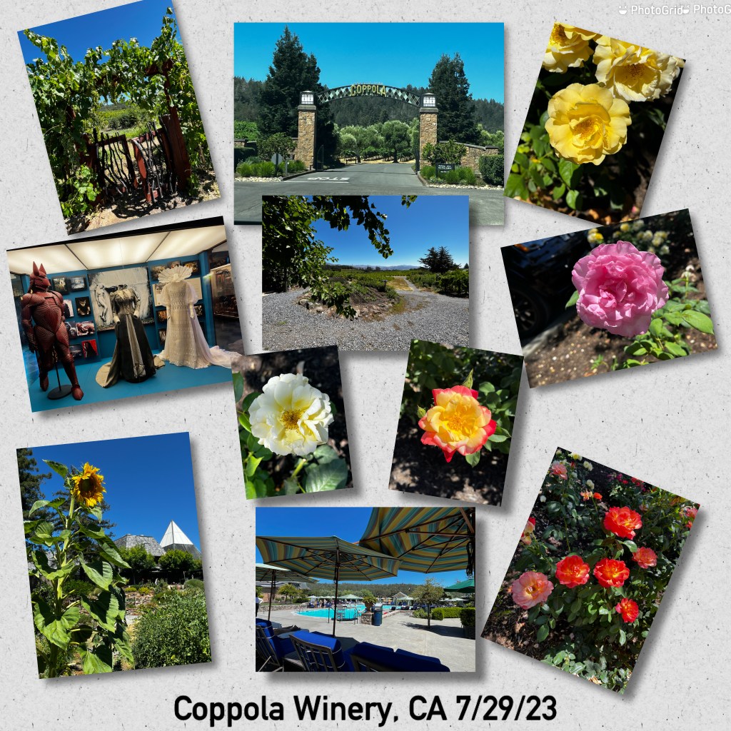 We made our way to “Wine Country”! Our first stop was Francis Ford Coppola Winery, Geyserville, CA, it was big and beautiful as expected. Inside the main building was a small shop, a wine tasting room, a bar room and indoor seating as well as a movie gallery with many items from his films. Beautiful pool area where you can rent a cabana or chairs for the day, but very expensive needless to say. Jim and Lorraine enjoyed a glass of wine while roaming the vineyard and the vegetable gardens. Large vineyards and an area with many herbs and flowers on the property too.
