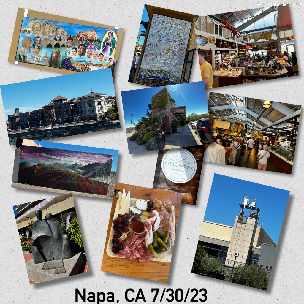 Our next day in Napa we visited the downtown area. First stop was Oxbow Public Market where we enjoyed a delicious charcuterie tray from the cheese and wine merchant. The market reminded us of the Reading Terminal as most of the markets do, but not as large. The men went right to Fieldwork Brewing while the ladies took a walk around town. We walked a lot this day with much to see, we even happened upon the Napa Porch Festival. The festival features an array of different bands playing on porches of homes throughout this small town. You can roam around many streets of bands, people, lemonade stands for you to enjoy.